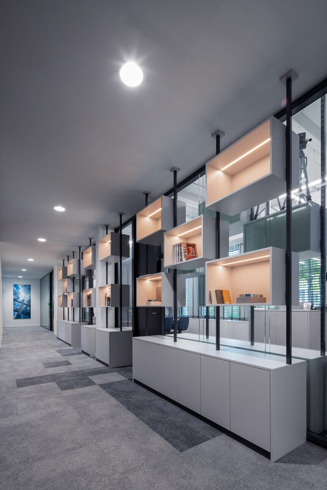 Diese Musterregale wurden speziell gemäß den Anforderungen unseres Kunden Goldbeck entworfen und gefertigt. Die indirekte Beleuchtung setzt jedes Element des Regals gekonnt in Szene und sorgt für eine einzigartige Atmosphäre. Foto: ©Paul Bosek
